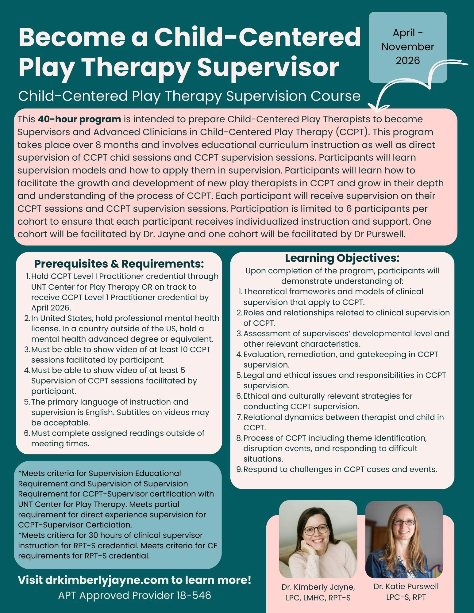 This 40-hour program is intended to prepare Child-Centered Play Therapists to become Supervisors and Advanced Clinicians in Child-Centered Play Therapy (CCT). This program takes place over 8 months and involves educational curriculum instruction as well as direct supervision of CCT chid sessions and CCT supervision sessions. Participants will learn supervision models and how to apply them in supervision. Participants will learn how to facilitate the growth and development of new play therapists in CCT and grow in their depth and understanding of the process of CCT. Each participant will receive supervision on their CCT sessions and CCT supervision sessions. Participation is limited to 6 participants per cohort to ensure that each participant receives individualized instruction and support. One cohort will be facilitated by Dr. Jayne and one cohort will be facilitated by Dr. Purswell.